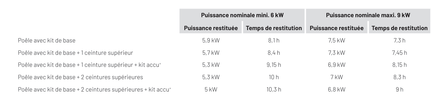 RÉSULTATS DES TESTS D'ACCUMULATION (POUR DIMENSIONNEMENT BESOIN THERMIQUE) La combustion du bois dans un appareil de chauffage génère une quantité d'énergie par unité de temps appelée puissance nominale de combustion. Celle-ci dépend de la qualité du combustible, de la quantité de combustible brûlé sur un temps donné ainsi que du rendement de l'appareil. La puissance restituée par l'appareil est la quantité de chaleur émise par celui-ci dans la pièce, elle dépend de l'environnement dans lequel ce dernier est installé ainsi que de la durée de restitution de chaleur. Poêle avec kit de base Poêle avec kit de base + 1 ceinture supérieur Poêle avec kit de base + 1 ceinture supérieur + kit accu+ Poêle avec kit de base + 2 ceintures supérieures Poêle avec kit de base + 2 ceintures supérieures + kit accu+ f lammes, le matériau d'accumulation prend le relai en libérant doucement la quantité de chaleur stockée auparavant. Un appareil à accumulation est un peu moins réactif pour chauffer la pièce, mais a pour avantage notable qu'après la fin de combustion la LORFLAM développe depuis une dizaine d'années, une gamme de poêle en fonte habillés de matériau d'accumulation (pierre ollaire, terre crue). Cette technologie permet de stocker dans ce matériau une part de l'énergie produite par l'appareil. Plus la masse d'accumulation est élevée, plus la quantité d'énergie stockée est importante, et plus le temps de restitution de chaleur est long. Dans cette configuration, lorsque l'appareil n'est plus alimenté en bois et que sa puissance nominale de combustion diminue jusqu'à l'extinction des Puissance nominale mini. 6 kW chaleur ou puissance restituée décroît lentement, sur une durée pouvant dépasser 10 heures.