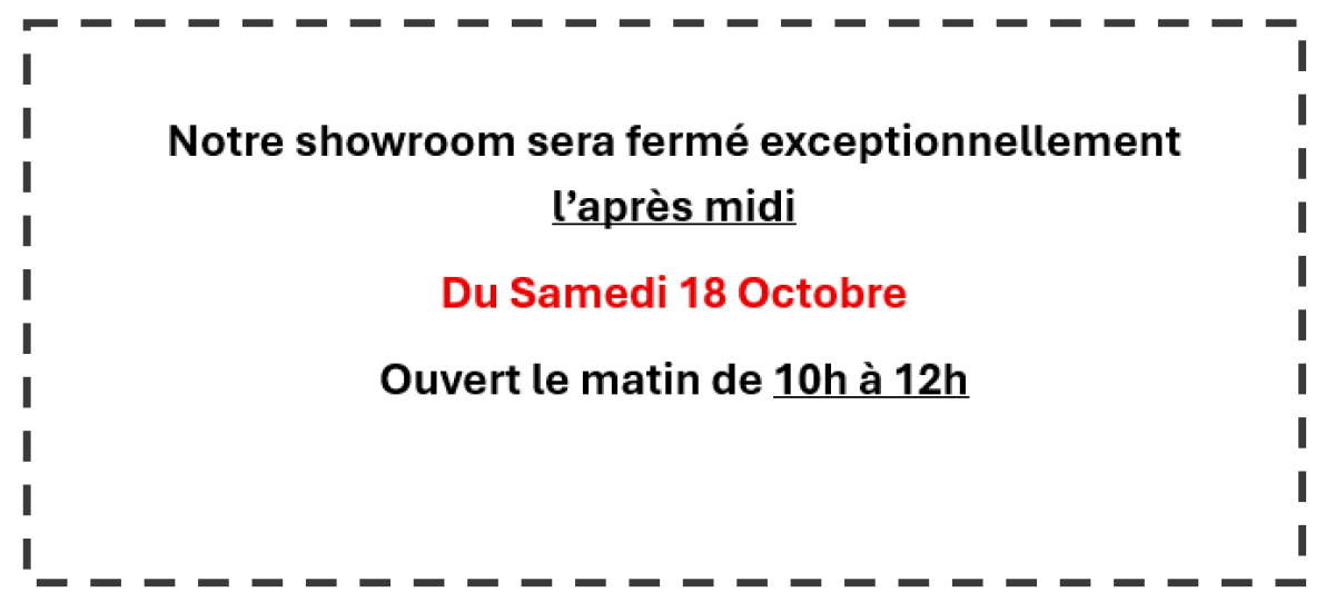 fermeture exceptionnelle ! Notre showroom sera fermé exceptionnemllement le samedi 18 octobre l'apres midi et reouvrira dès le lundi 20 octobre à 14h le samedi mati (18 octobre nous serons ouvert de 9h30 à 12h Partagez Facebook Twitter Email Article précédentPORTES OUVERTES ! Retour à la liste