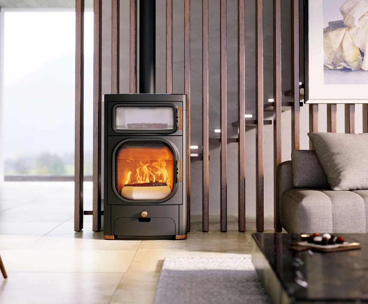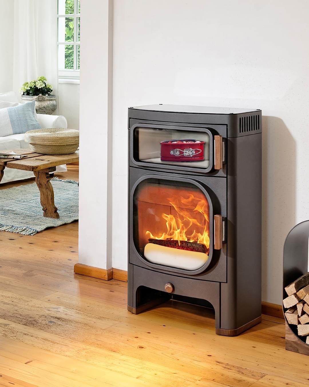 Faire des gâteaux, cuire des rôtis, se chauffer et être magnifique de surcroît ? Seul le Heidi en est capable ! Une plaque vitrocéramique sur toute la surface offre de la place pour garder les plats au chaud, pendant que le four permet de cuire un rôti, un gâteau, une pizza ou un pain. Mais le chauffage n’est pas en reste, le plaisir est évidemment au rendez-vous. Une grande porte en fonte vous permet de profiter généreusement des flammes pendant que vous vous réchauffez à la chaleur bienfaisante de votre poêle. Et cerise sur le gâteau, vous pouvez choisir d’intégrer l’option Air +, contrôle électronique de l’air qui permet de réguler l’arrivée d’air de façon automatique et d’obtenir ainsi une qualité de chauffage absolument parfaite !