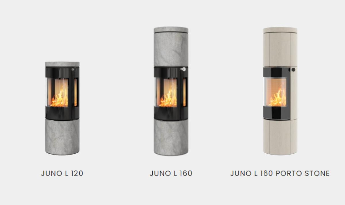 Juno L est un poêle state-of-the-art et presque un poêle à bois sculpturel, où les légères pierres naturelles joliment arrondies se tiennent en contraste frappant avec le feu ainsi qu'avec le verre brillant et l'acier. La grande vitre offre une bonne visibilité sur le feu en mettant les flammes en valeur.