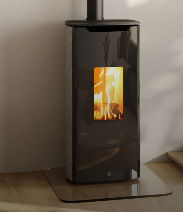 Poêle mixte de dernière génération, 6,8 kW – 8,2 kW, canalisable. Design moderne et compact. Finitions : verre blanc, noir, pierre ollaire ou verre Stardust de la ligne Elegance.
